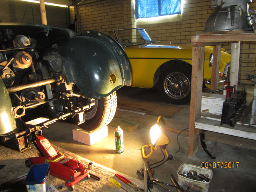 Bob says: As you can see from the photo I have the front off the TR2 to replace the fan and overhaul the steering. To assist I have bought a high intensity light that works brilliantly, generates fantastic light but, even more heat in a significant arc around the apparatus.....even behind it. Have a close look and you can see that whilst working I am using a spray can of water dispersant/lubricant and I have used it and put it down to concentrate on removing the drop link at the bottom of the steering box which, as you all know is hard to access. Now I have staged this photo for demonstration purposes. After a few minutes, perhaps 5 minutes, I had to use the spray can again. Well, the can was RED HOT and I do not exaggerate. I dropped it immediately and then saw the real danger, a possibility of it EXPLODING.