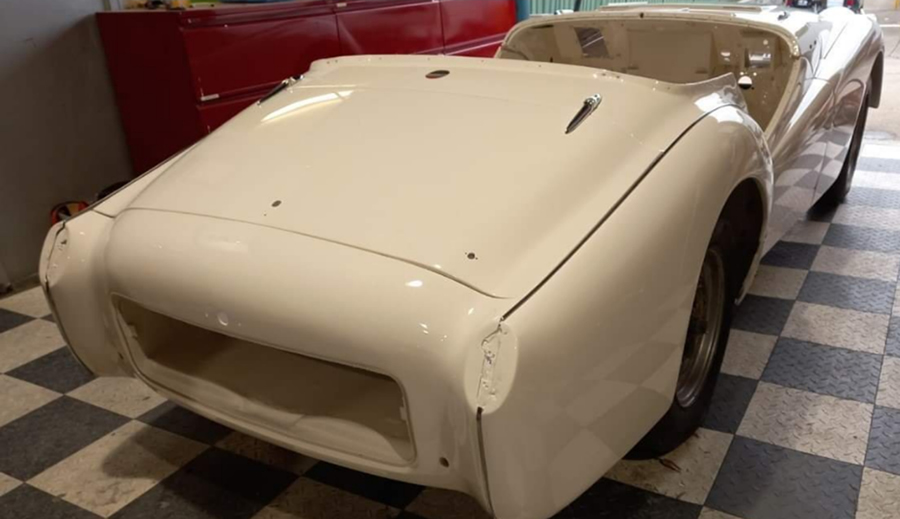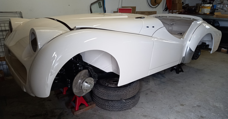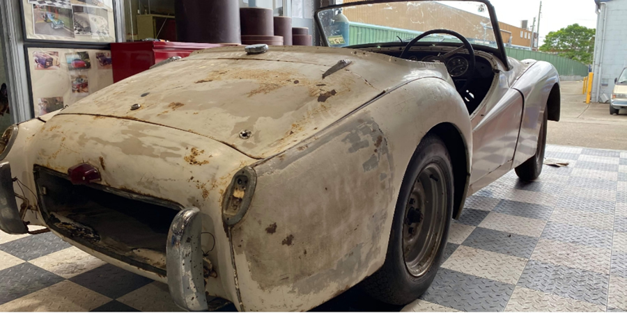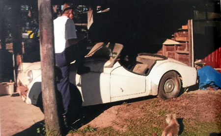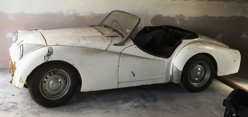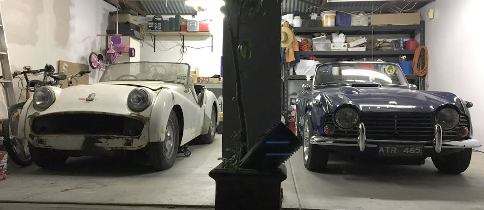 Rowan says: I bought the car back in 2010 from Steve & Rosi Innes (Batemans Bay). Some members from the local TSOA club had met Steve when they were down that way in their TR3A and Steve had told them about his, which had been stored under their house for around 20 years. Dad and I went down soon after and had a very nice morning with Steve and Ros, including a few pieces of "Rosi's slice" and a cuppa, packed up the car onto the trailer, including a number of spares in the boot. The car then sat in my Grandfather's workshop another 7 years as I bought a house, renovated it, sold my Triumph Herald to fund the building project, got married, moved overseas for a year, changed careers, had two kids... and finally Grandad decided to downsize and the TR had to be moved to my house. The garage is lined and still needs some improved storage and lighting etc, but I have now begun familiarising myself with the car, reading in greater detail, and trying to work out a restoration plan. I may very well be up for a body-off restoration, in which case I will have it resprayed. The TR Register gurus have discovered that it is #057 of the CKD TR3s assembled in Melbourne. As I understand it, this means that there is no record of original trim and paint details. As I have been exploring the car I have discovered that under it's white coat is a purple coat, and under that I believe is possibly the original cream colour. The car does have a later TR3A engine, and front discs. When I drove Bill Revill's TR3 a number of years ago I was absolutely frightened... it's a whole nother style to driving the Herald! I'm very much looking forward to driving my own, making trips with my wife and with my kids as they grow up, and touring along with my parents in Dad's TR4A. ". |
