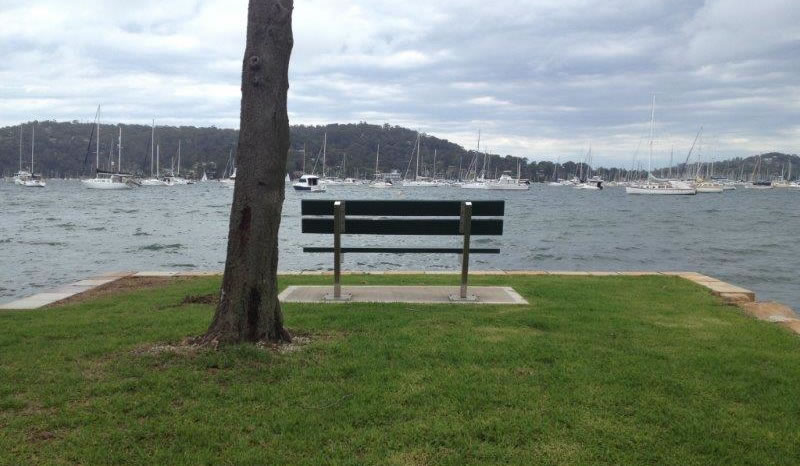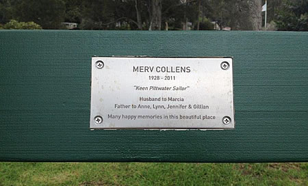 | Gavin Rea found this memorial to Merv Collens next to Quays Marina at Bayview. He says "It was very touching and most appropriate that Merv should have a memorial plaque there as he and Marcie spent a huge amount of time sailing the waters of Pittwater." Click Pic to view the spot. |