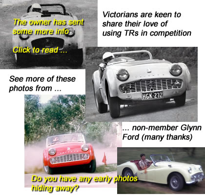 MYSTERY TR3A Member Pat Walsh sent in photos of a TR3A owned by a friend's father, John Chalk, who recently passed away. The car doesn't appear on the database. All we know is that it is a Powder Blue TR3A rego number NSW CGG-010. Please email Rick if you have any information. Info Received: one photo was taken at Berrara near Sussex Inlet on NSW S Coast Other evidence also points to the car possibly residing in the South Coast area. And another 5 photographs have been found |