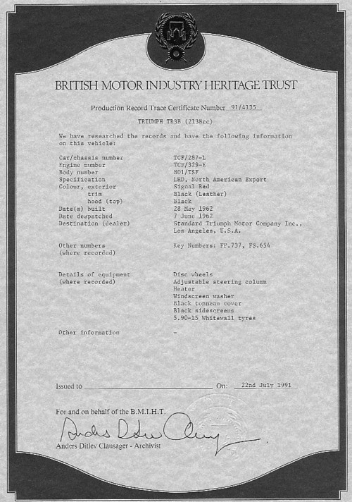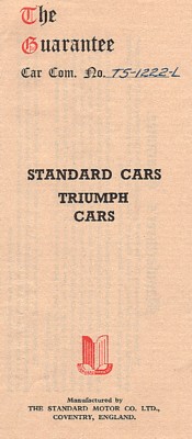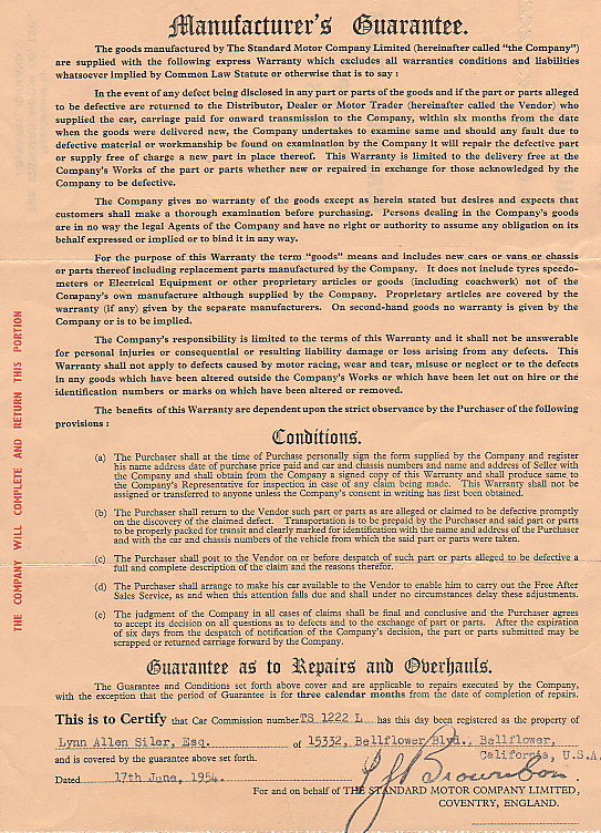 Original Manufacturers guarantee with one of Lynn Silers previous cars - TR2