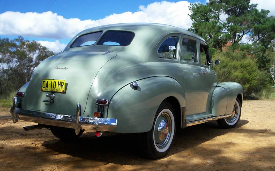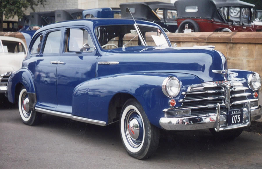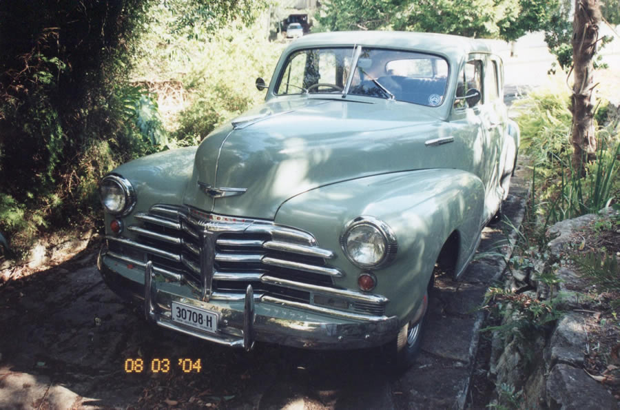 The 1948 Fleetmaster Sedan was bought in 1994 for long distance runs. It had survived years as a piece of playground equipment in an orphanage. It was restored by a RAAF stores officer hence the blue paint job. The interior trim was donated by the PM who had more than enough spare seat material for his Boeing. It was an excellent car. |