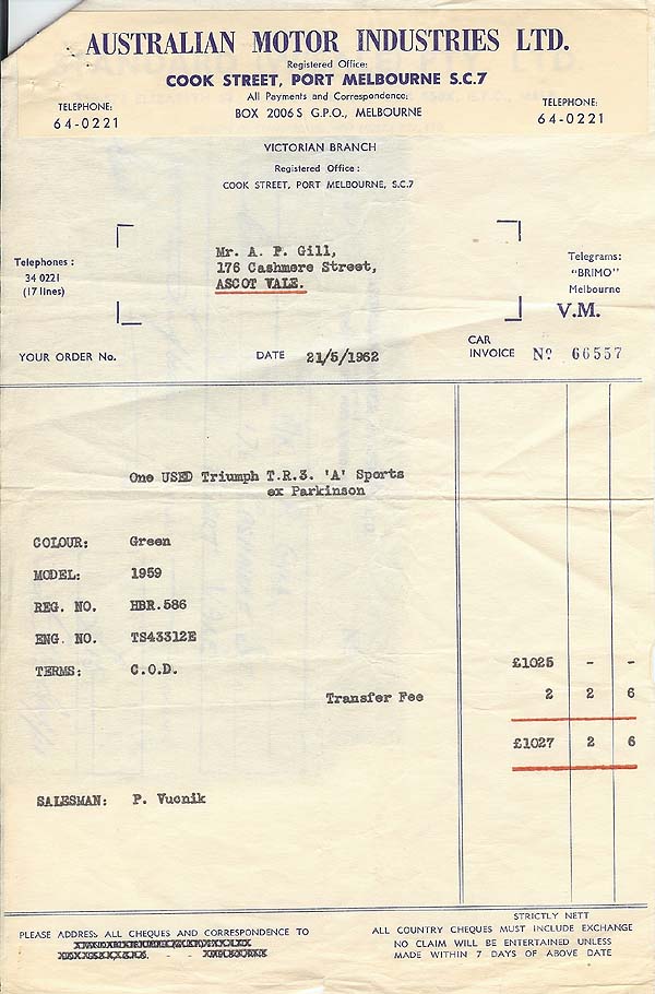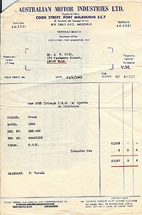This one was sent in by John Kay from Launceston TAS. It is an early sales receipt for his car dated 1962 |