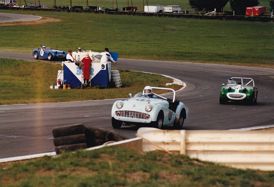 this 3A. He also owned a TR2 at one stage, along with a red E-type Jaguar . More info from Peter Standen (VIC): "The blue TR3A seen in the photo of Winton in the 1980s belonged to (and was raced by) Gavin Baillieu using number 17 until at least 1987. I believe Gerry Lawson bought it off Gavin some time later. I thought I recognised the car from watching it at Winton in the 80s and have recently found some photos I took of it from then. I also found an old program from 1987 that still has Gavin dri ving it. It also had Andrew Millis in the green 3A and Kel Ricci in a white one. interestingly Andrew’s car was 2 litre and the other two 2.2 litre." |