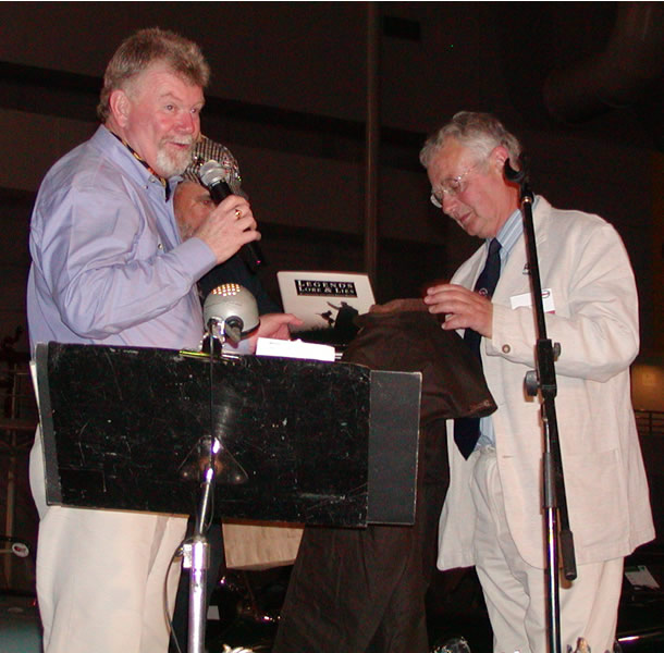 Gary officiates at Brisbane in 2005 as Bill Piggott is presented with a "Drizabone" coat.
