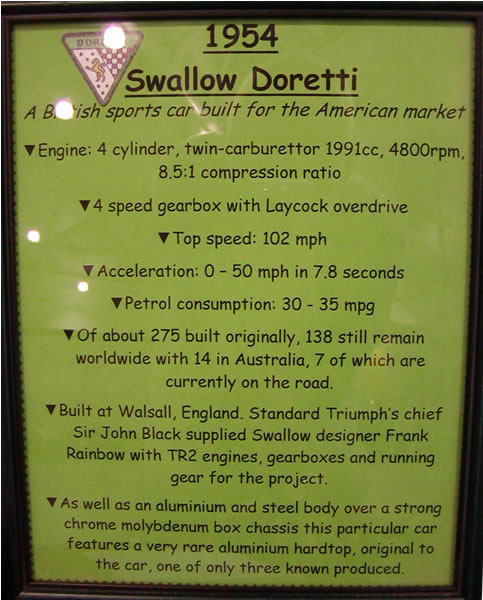 It has a modified grille. 2003 update: - the car has had a full body-off restoration. Note that this is one of only 3 Dorettis worldwide with a factory hardtop. Car is now on Historic plates. The Commission number is 1198, and the engine number TS 3690 E. |