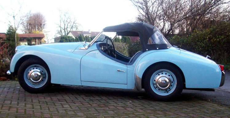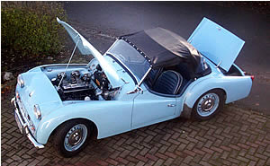 "In November 2003 I purchased a TR3B which was built in August 1962 and sold the same year in New Jersey to Faith E. Springer. In 1978 this car was sold to Howard C. Springer and brought to Honolulu Hawaii. In early 1990 she went to Europe/ Germany. Once around the globe! After spending 5 years for a frame-off restoration, I brought my powder blue TR back to life in September 2008."