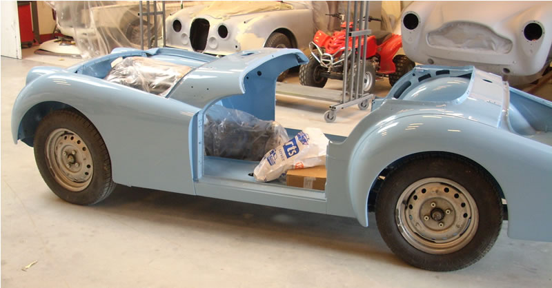 A freshly painted car! (Colour: PPG X0034) Menno has sent this little history of his car: Rick, A few years back I moved house and asked a friend to look after my Spitfire for a few weeks: I needed the garage space. At the back of his workshop was a derelict powder blue TR3A. An abandoned restoration project. To make a long story short: I sold the Spitfire and became the new owner of a TR3A, mostly packed in greasy boxes. And now, nearly four years later, the car is shiny powder blue again! I put the car back together over a period of 15 months. Cutting corners (moneywise that is), got it approved by the authorities (safety, roadworthiness etc) and started to drive the car. Later that year, I decided to take the car apart again and start a full restoration. I turned to Henk Bongertman ( www.bongertmanautotechniek.nl ) and he helps me with the restoration: strengthening the chassis, helping me to decide what parts to use etc. The car is stripped to that last nut and bolt. And I'm not a concours attender. So, the car is modified to suit modern day traffic: uprated brakes, Revington steering parts, bespoke loom etc. You can follow the restoration on www.tr3a1959.nl and for more detailed pics: http://s211.photobucket.com/albums/bb315/TR3A1959/