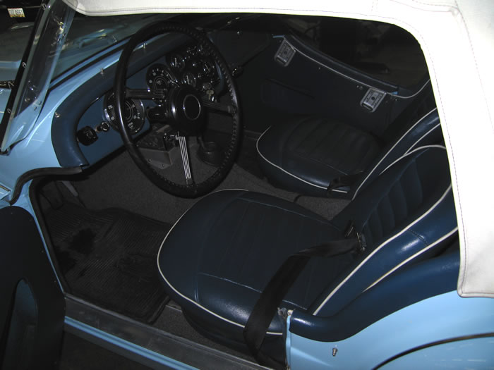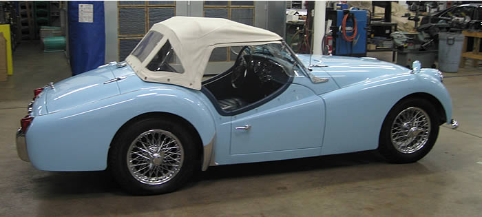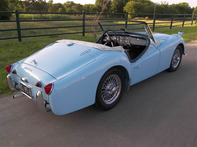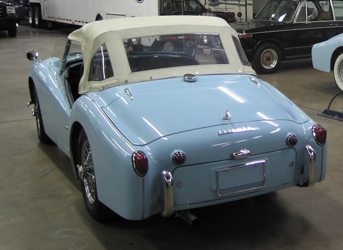 Rene says: She is a 1962 Powder Blue TR3B built in May 1962. (TCF 181 LO) Blue interior with white piping, white top, ashtray, map light, rear seat, "Triumph" rocker cover and a radio. U.S.A National Concours winner (1st Place-TR3 and Best In Show). This car is older than I am and in better shape. (2nd owner) Name: "Frisky" Lady Sings the Blues. Thank you, Giovanni Michelotti.