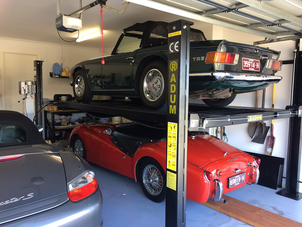 I originally wrote this for the TCCV magazine. This might be of interest to Triumph owners. We live on a small block of land and can fortunately store 2 cars in the garage and 2 cars under the deck - effectively a carport. The problem is that under the deck is not a great place for a classic car, even when covered with a car cover. We looked for better options such as building in under the deck but that would make rooms much darker, clear plastic café blinds, etc. Then we saw a car stacker holding a couple of Porsches!!! After quite an extensive search and a few emails, we found a supplier in Tullamarine, thanks to Terry Roche (TCCV). Car stackers made in USA seem to be about $4500 to $5000 plus installation. There are 2 main brands made in USA it seems. They are not easy to source here, although Bursons is an agent. The Radum brand is designed in Australia and made in China. It complies with Australian Standards. Terry has been happy with his for 5 years and the clincher for us was that the storage place we use near Melbourne Airport when we travel, has a bank of about 12 of them. They use them all day every day with no issues. We installed a 4 post hoist last Saturday morning- it took 3.5 hours- just 2 of us. We used an engine lifter and a magnet from work to lift the runways- one of them weighs about 250kg!!!. The rest can be lifted easily. The instructions are straight forward and relatively accurate (albeit written in Chinglish). The kit includes everything- all the nuts and bolts, dynabolts, electric motor, etc. The price of this model is about $3200. I am happy to answer any questions you have. Check out the website www.radum.com.au. Now we can get 3 cars in the garage and 2 under the deck. We have a spare spot for another classic but don’t tell Jenny! (The reason for the TR6 being on top - it is house trained and the TR3A still has a need to mark its territory!!!! There are drip trays included with the hoist which catch most drips!) David and Jenny Ferguson |